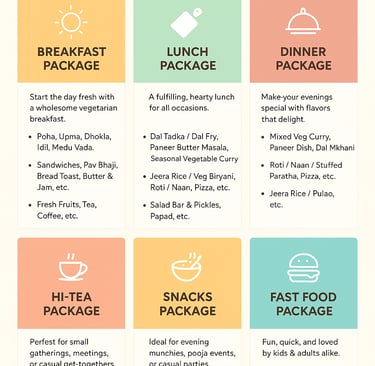 We also specialize in light-bite packages such as hi-tea, fast food, and snacks – perfect for birthdays, anniversaries, and small gatherings. Jain, vegetarian, and vegan options are always available to ensure inclusivity.