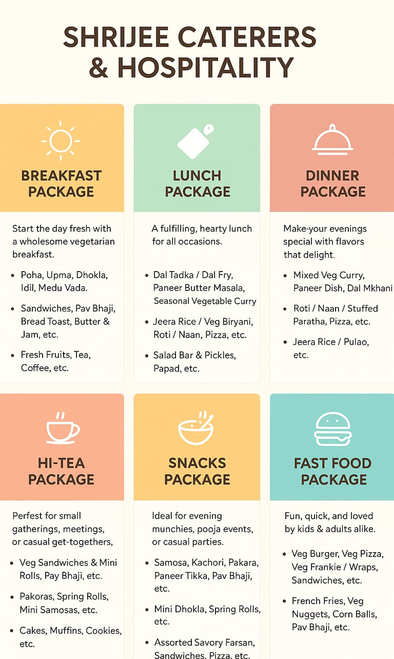 At Shrijee Caterers, we offer thoughtfully designed catering packages that combine taste, quality, and value. Whether you’re planning a wedding, corporate event, festival, or family celebration, our menus are crafted to suit every guest and every occasion.
